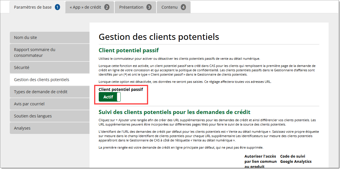 La section « Gestion des clients potentiels » vous permet de créer des liens uniques pour les demandes de crédit direct au consommateur de votre établissement concessionnaire. Cette section vous permet d’activer les clients potentiels passifs, de créer et de nommer des liens, et d’exclure certains clients potentiels de l’affichage sur la page du lien de vente au détail numérique.