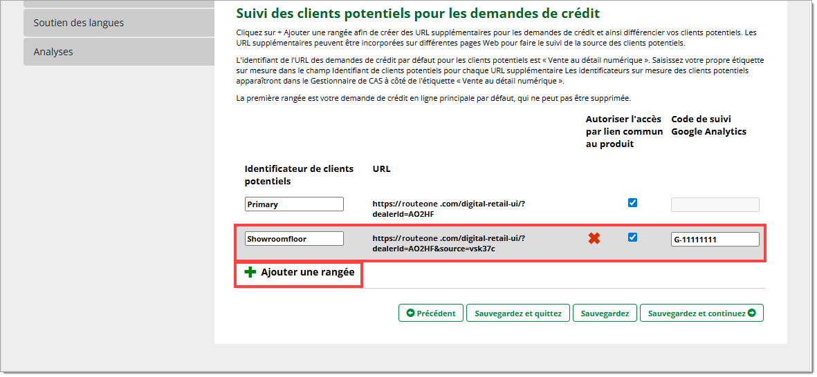 Faites défiler la page jusqu’à la section « Suivi des clients potentiels pour les demandes de crédit », où vous pouvez créer des URL supplémentaires pour les demandes de crédit avec des noms uniques (« identificateurs de clients potentiels ») associés à votre abonnement, afin de différencier vos clients potentiels sur la plateforme RouteOne.