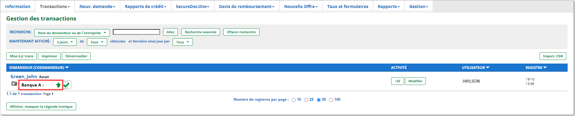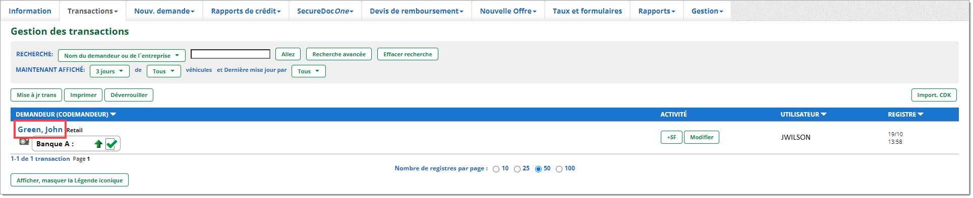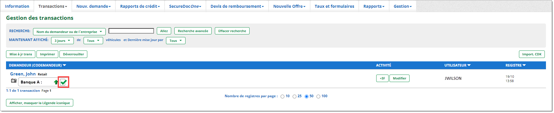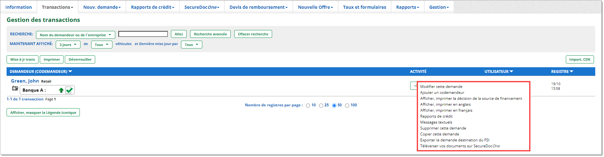 La page « Gestion des transactions » est une barre de navigation importante pour les utilisateurs de RouteOne. C’est là qu’ils peuvent effectuer le plus grand nombre de tâches et d’actions dans le système. Ils peuvent effectuer toutes les actions liées aux demandes de crédit, y compris les tâches relatives à la conformité, à partir de cette page.