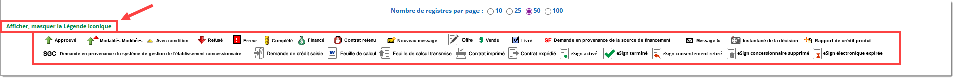 Pour afficher la légende des différents statuts de demandes de crédit et de leur signification, cliquez sur le bouton « Afficher, masquer la Légende iconique » au bas de la page. Vous connaîtrez ainsi le statut exact de la demande.