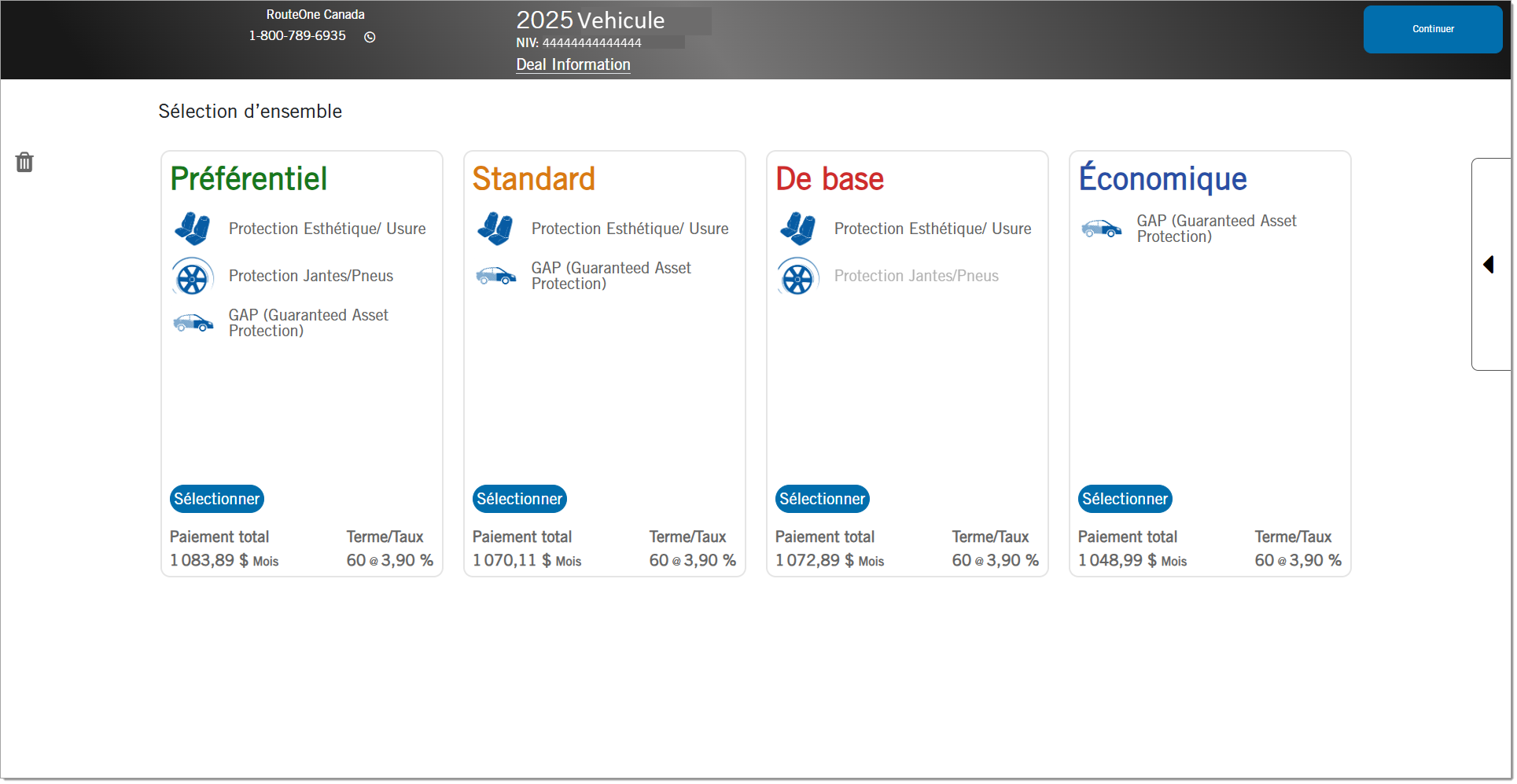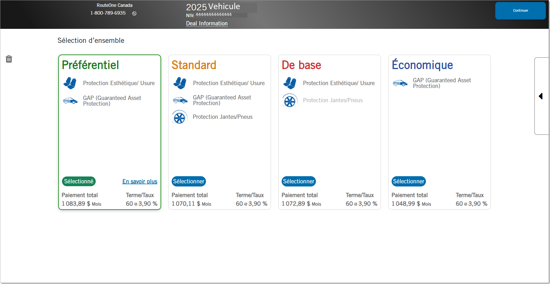 Le client peut consulter chaque paquet et choisir celui qu’il souhaite se procurer. Il peut également sélectionner un ou plusieurs produits faisant partie de forfaits différents, en les glissant et en les déposant dans le paquet de son choix. Pour ce faire, le client doit premièrement cliquer sur le bouton « Sélectionner » associé au paquet souhaité. Le paquet se trouvera dans un encadré vert et le bouton « Sélectionner » indiquera maintenant « Sélectionné ».