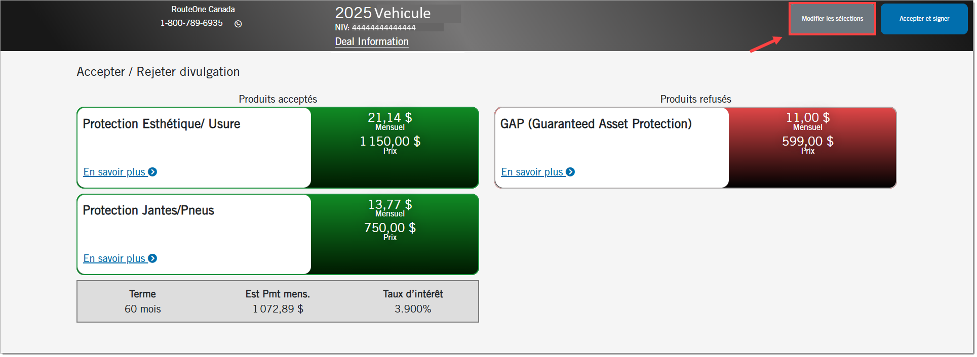 Dès la confirmation des produits, le client doit cliquer sur le bouton « Accepter et signer », qui le dirigera vers la « Divulgation de renonciation Accepter/Rejeter ». Ceci est la dernière occasion pour le client de modifier ses sélections, en cliquant sur le bouton « Modifier les sélections » dans le coin supérieur droit. Lorsque le client aura pris connaissance des modalités, il devra signer son nom dans le champ de signature et cliquer sur « Terminé ».
