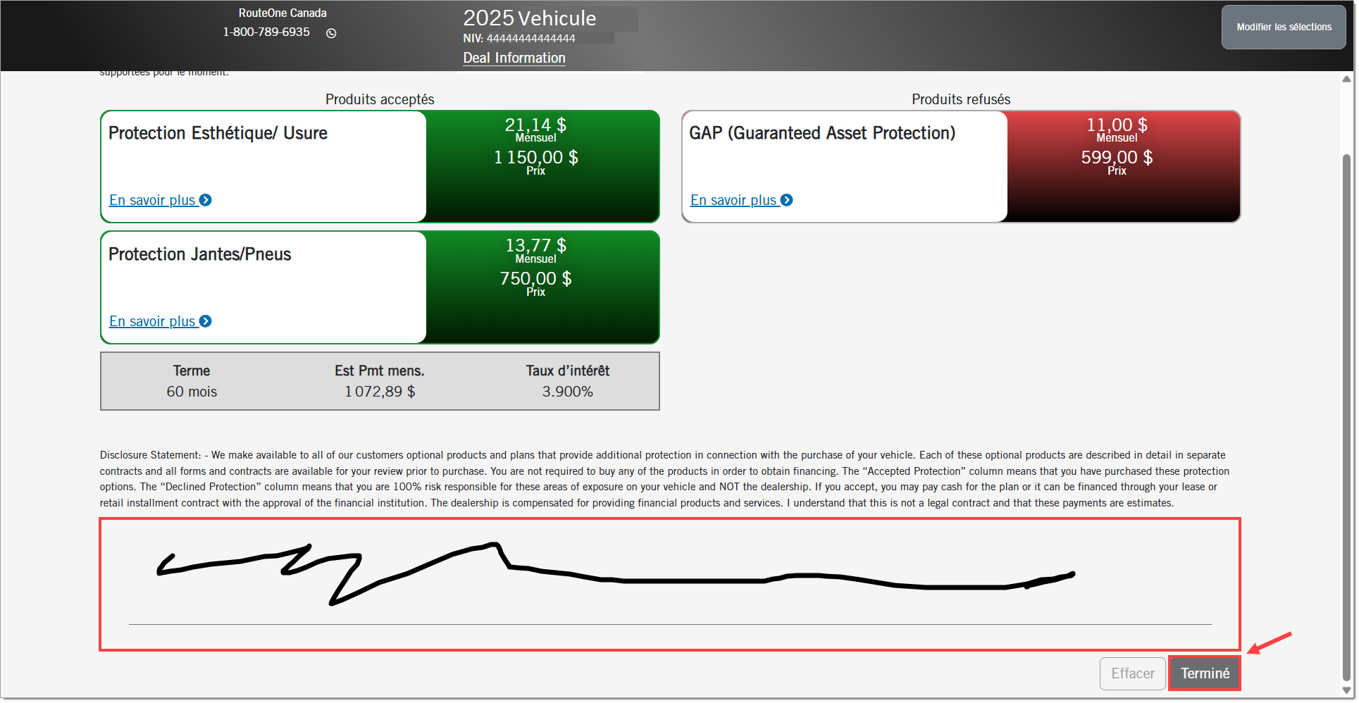 La section « Accepter/Rejeter » et l’étape de signature sont des options pouvant être configurées, que le concessionnaire peut activer/désactiver.