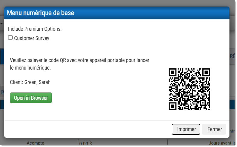 Si vous accédez au menu depuis un ordinateur, cliquez sur le lien direct menant au menu numérique. Si vous accédez au menu depuis une tablette, utilisez la caméra de la tablette pour balayer le code QR sur l’écran de l’ordinateur et ainsi accéder au menu numérique sur la tablette. Ensuite, remettez la tablette au client, lui permettant de consulter et de sélectionner le paquet souhaité.
