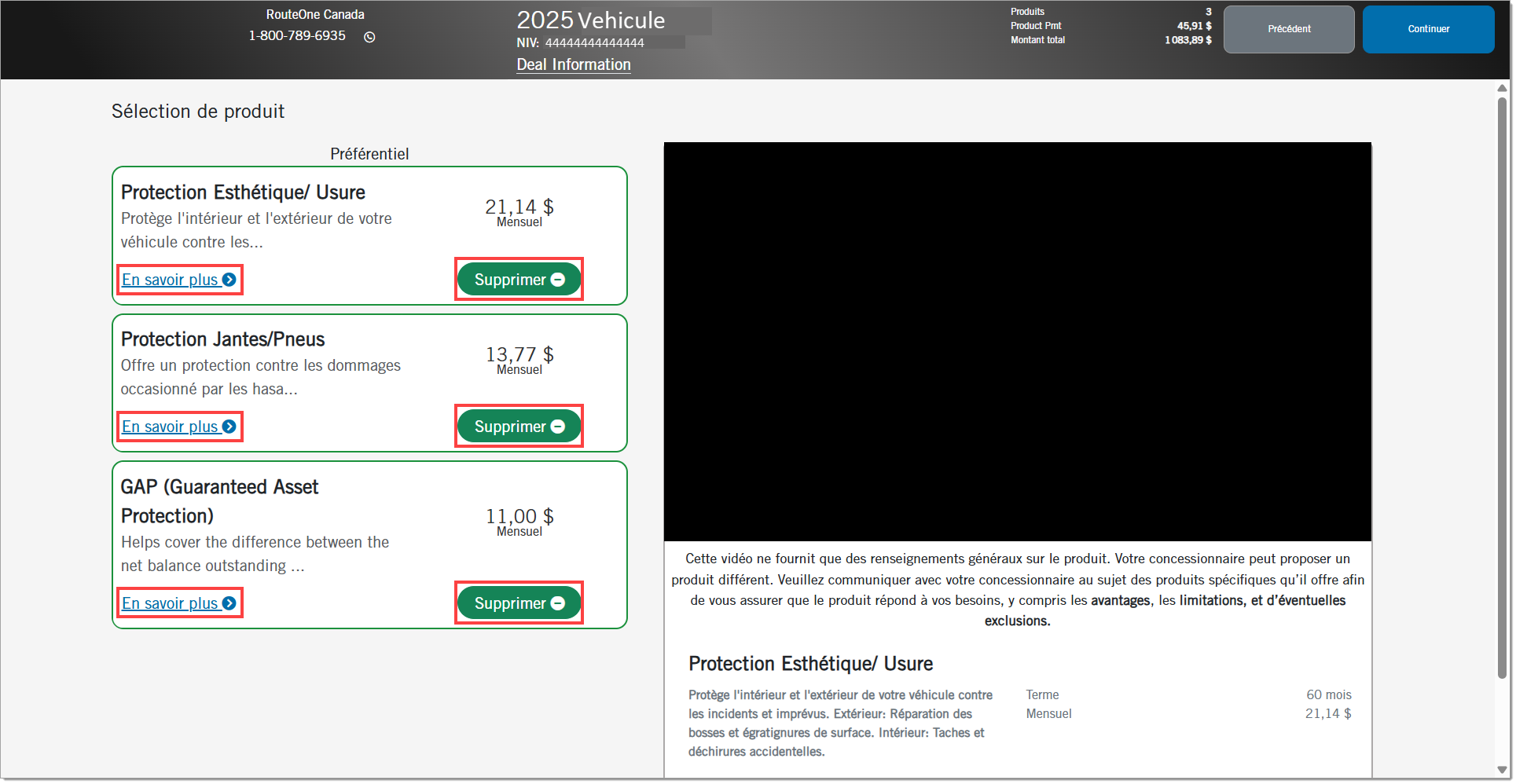Le client verra maintenant son paquet sélectionné, affichant les prix détaillés pour chacun des produits. Le lien « En savoir plus » le mènera vers une vidéo, effectuant un survol de ce produit.
