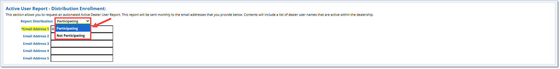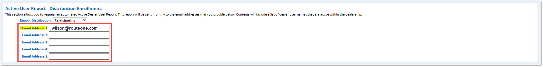 This section allows you to request an automated Active Dealer User Report. This report will be sent monthly to the email addresses that you provide. Contents will include a list of dealer user names that are active within the dealership.