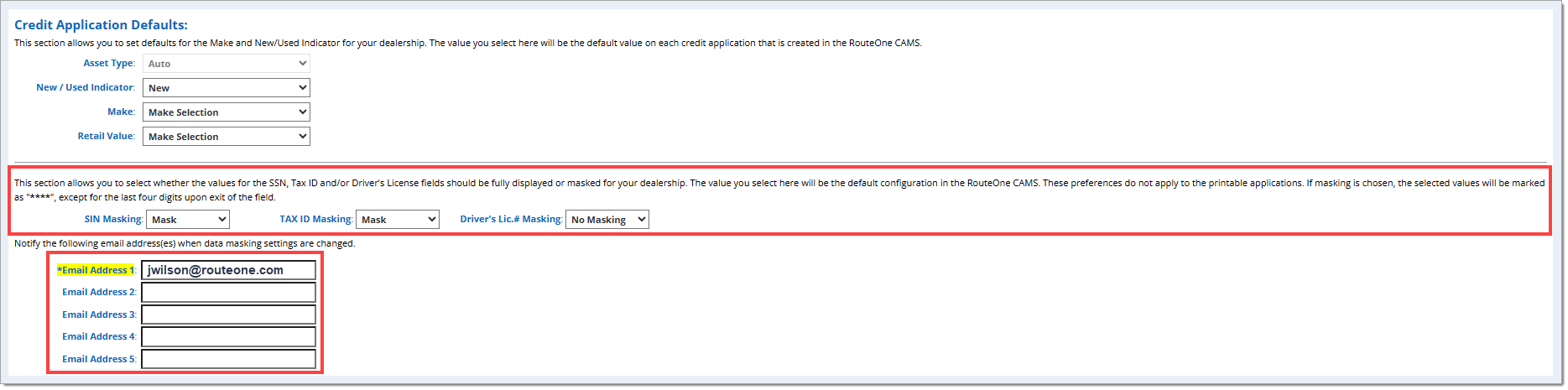 The value you select here will be the default configuration in the RouteOne Credit Aggregation System (CAS). These preferences do not apply to printable applications. If masking is chosen, the selected values will be marked as "****," except for the last four digits upon exit of the field.