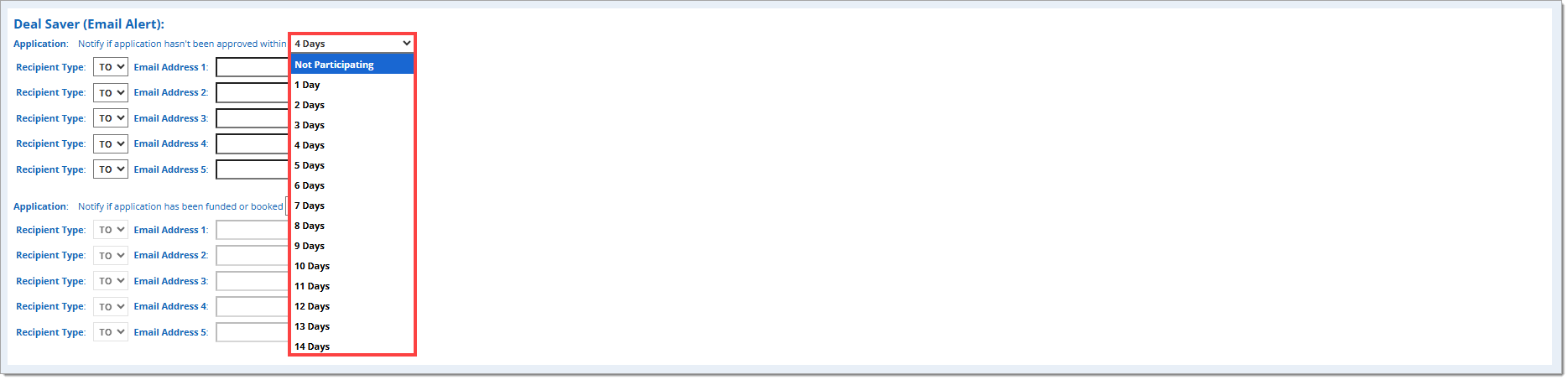 Use the right-hand dropdown menu for application approval to select the amount of time before the system triggers a notification to the emails.