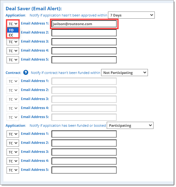 Enter up to five email addresses in the respective fields and use the drop-down menus on the left to designate whether the recipient gets a direct email (TC) or a copy (CC).