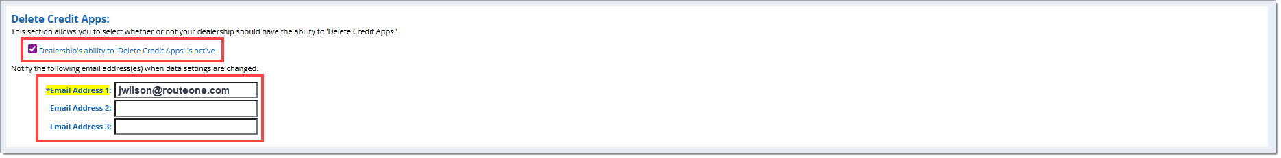 This section allows you to select whether or not your dealership should have the ability to 'Delete Credit Apps’ and set email addresses to be notified when the setting is changed.