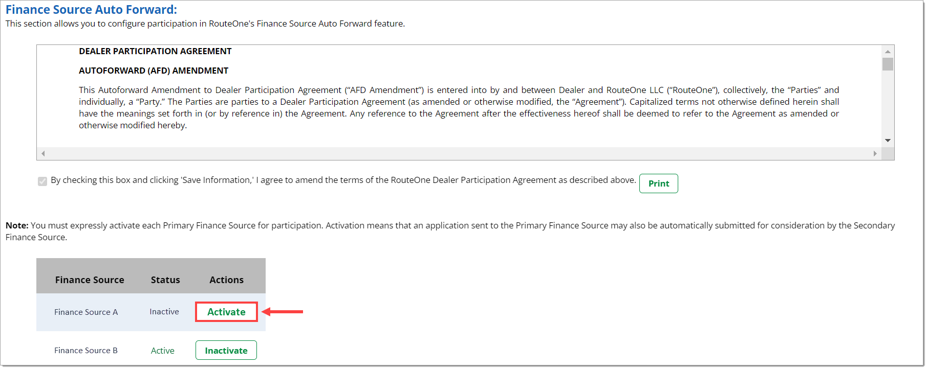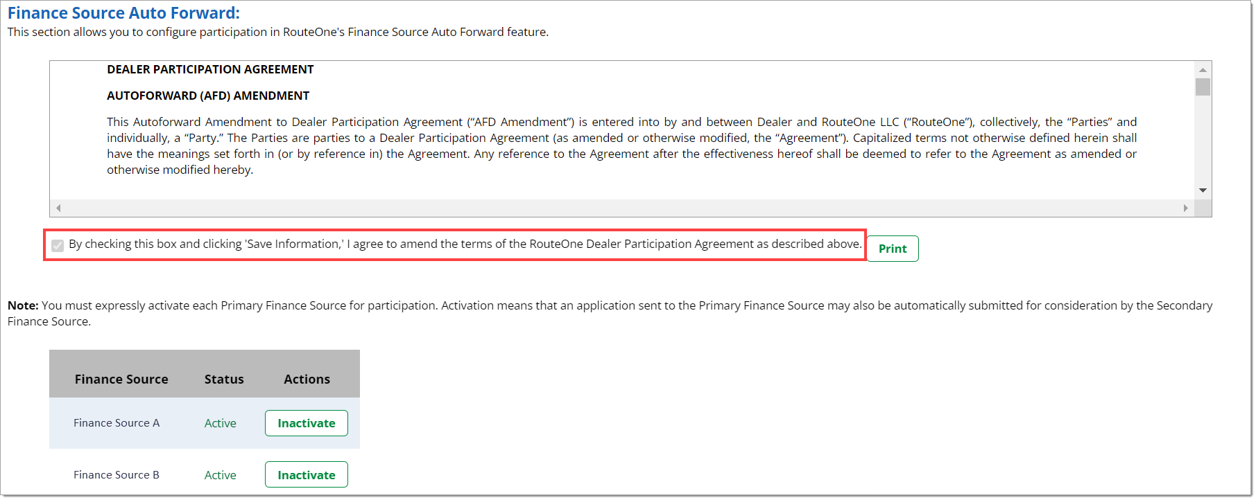 In order to participate in Finance Source Auto Forwarding, you must first agree to the ‘Dealer Participation Agreement Autoforward (AFD) Amendment.’ To agree, click on the checkbox under the agreement. Then scroll to the bottom of the Dealer Preferences page and click ‘Save Information’ to finalize the agreement.
