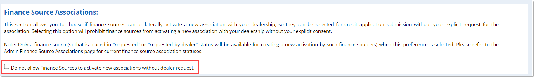 This section allows you to choose if finance sources can unilaterally activate an association with your dealership, so they can be selected for credit application submission without your explicit request for the association. Selecting this option will prohibit finance sources from activating your dealership without your explicit consent.