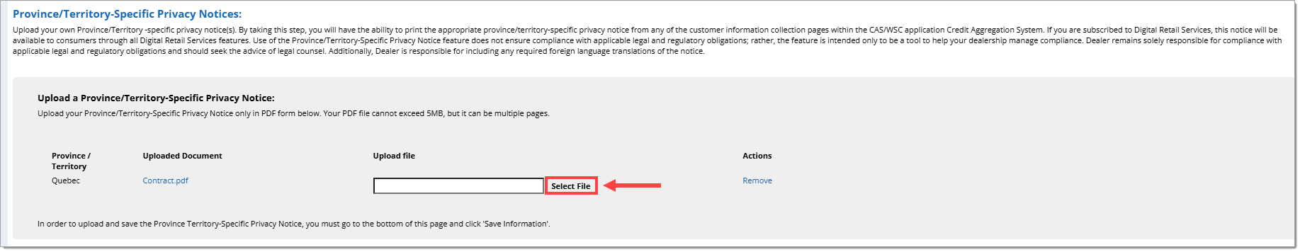 To upload a province/territory-specific privacy notice, click the ‘Select File’ button for the respective province/territory.