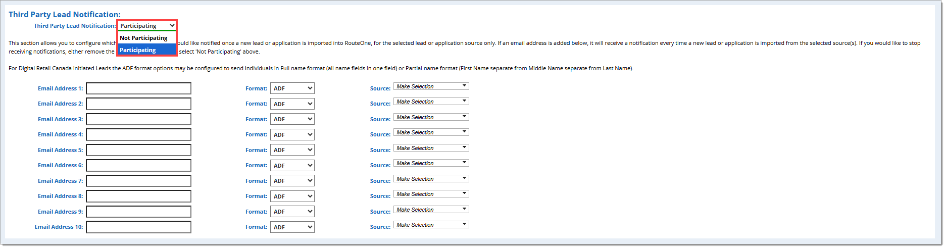 To enable Third Party Lead Notifications, set the ‘Third Party Lead Notification’ drop-down menu to ‘Participating.’ Conversely, if you would like to stop receiving notifications, either remove the email address or select 'Not Participating.’