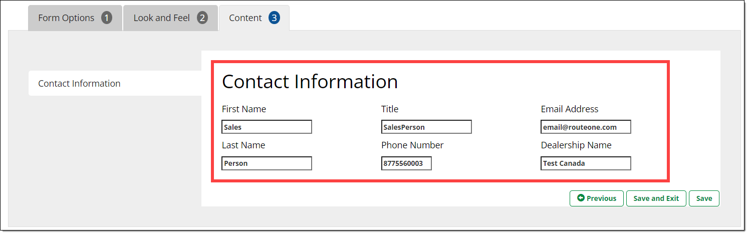 You can customize dealership contact information (first name, last name, title, phone number, email address, dealership name) that is displayed to the applicant once they submit the Lead Capture Form.