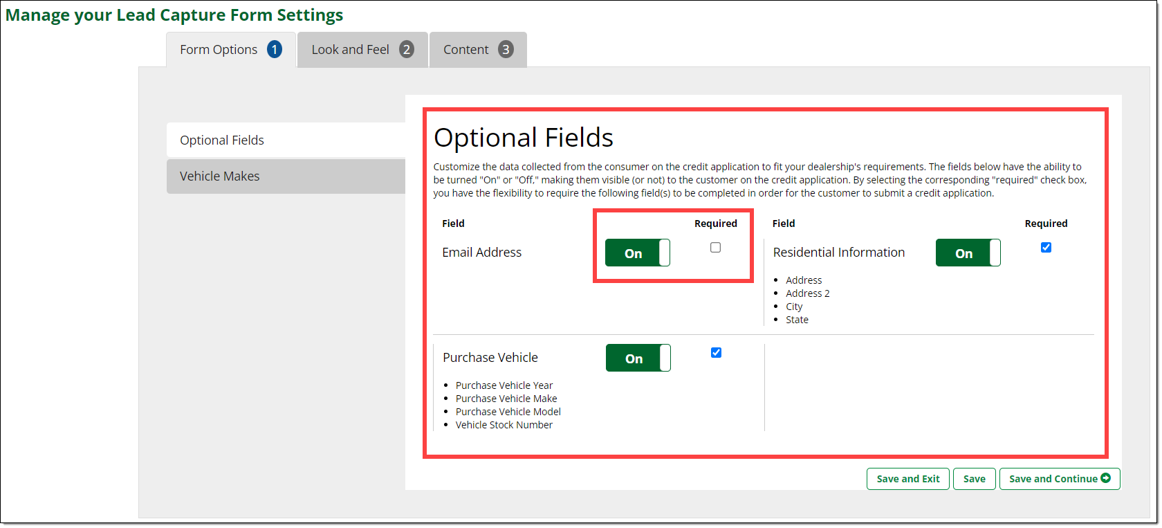You can customize the data collected from the applicant on the Lead Capture Form to fit your dealership's requirements. The Email Address, Purchase Vehicle, and Residential Information fields can each be toggled On/Off.