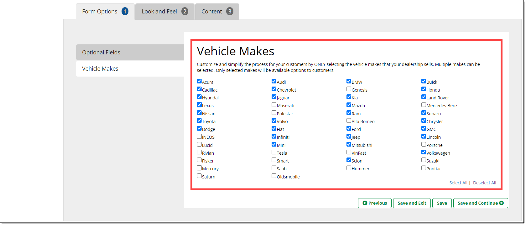 The Form Options tab is where you can configure optional fields and vehicle makes that will be included in your Lead Capture Form.