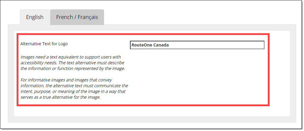 When adding your logo, you will also be able to add Alternative Text, which will allow users with accessibility needs to use a text equivalent of the image. The text alternative must describe the information or function represented by the image. Both English and French options are available to configure.