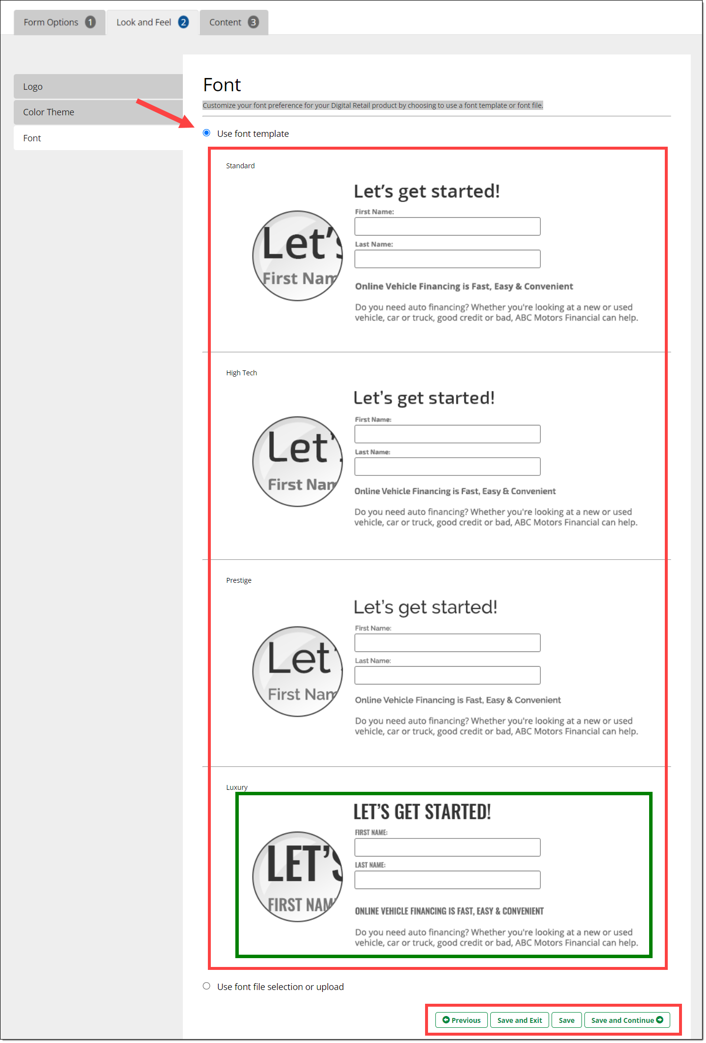 The default setting is to select from the available font template options on the page. Click any of the font templates. Your selection will be highlighted in a green border.