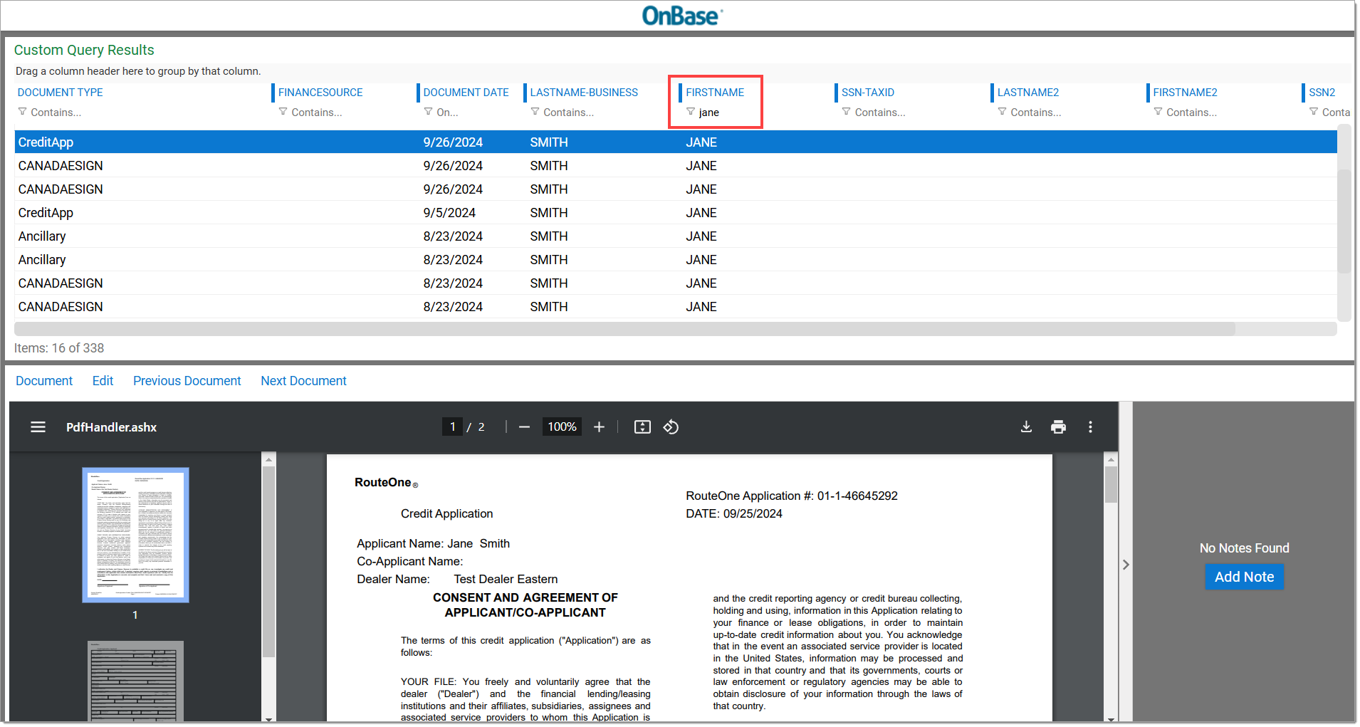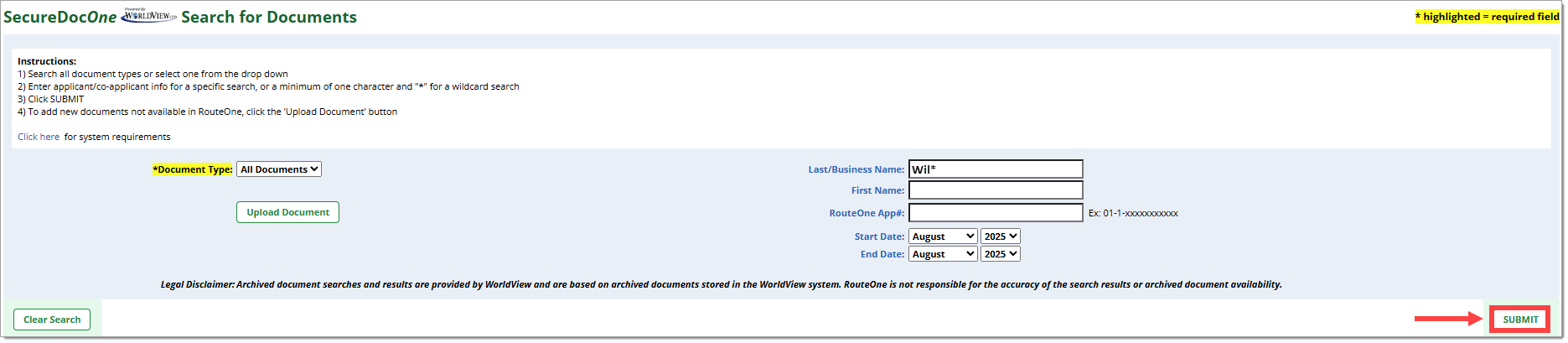 Enter the criteria for your search. You can search by Last/Business Name, First Name, and/or RouteOne Application #. You can also select a date range using the ‘Start Date’ and ‘End Date’ dropdown menus.