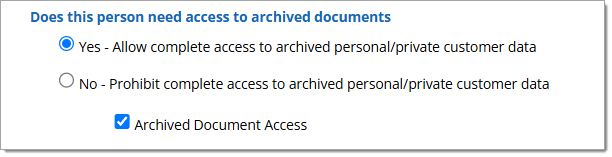 Note: Both ‘Yes – Allow complete access to archived personal/private customer data’ and the ‘Archived Document Access’ must be enabled.