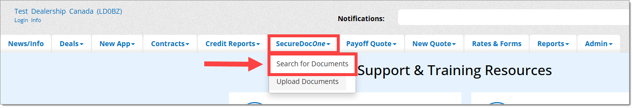 To locate a document, hover over the ‘SecureDocOne’ tab and select the ‘Search for Documents’ option.