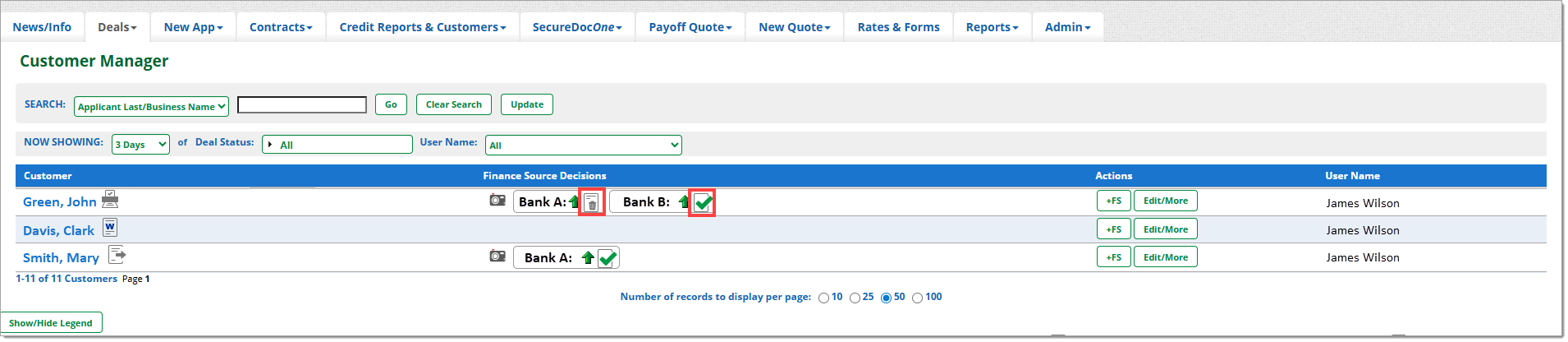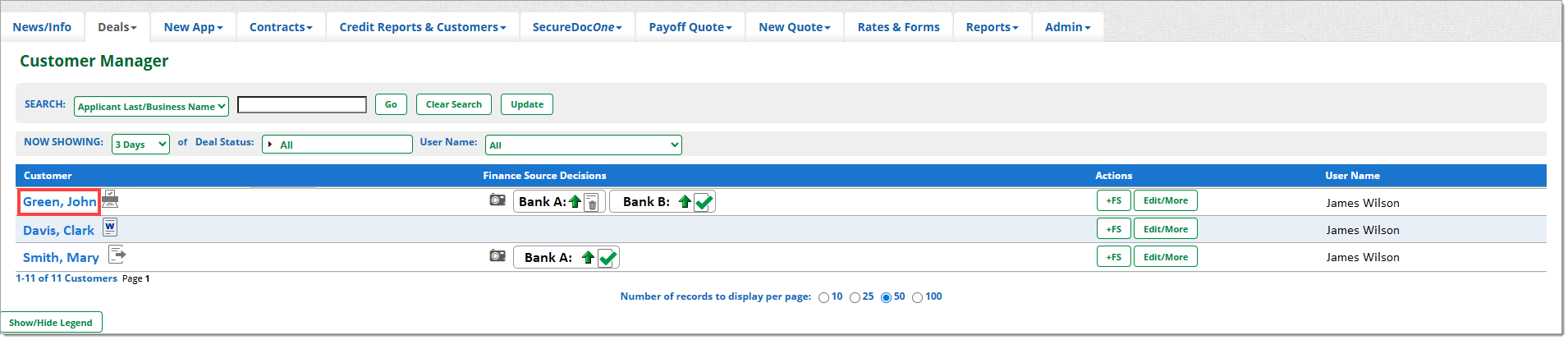 The status of the customer’s deal worksheet and contract appears directly to the right of the customer’s name.