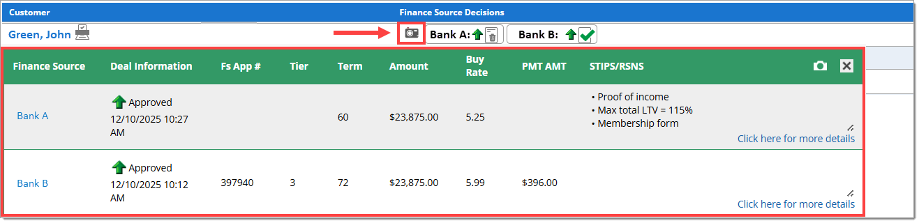 Click the ‘Camera’ icon to view the Decision Snapshot, with which you will be able to compare the customer’s deal details without having to navigate between different tabs to collect and access the information.