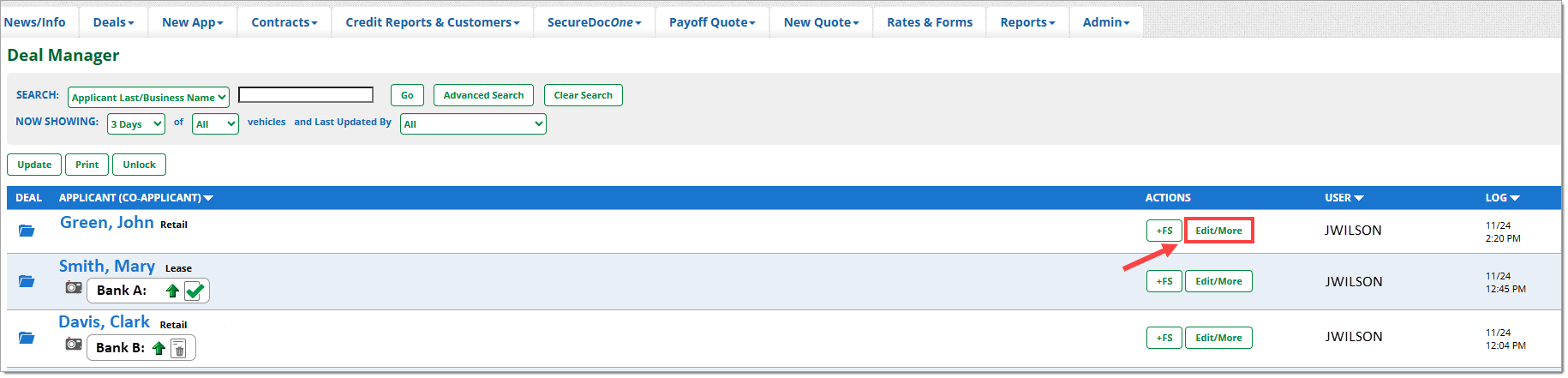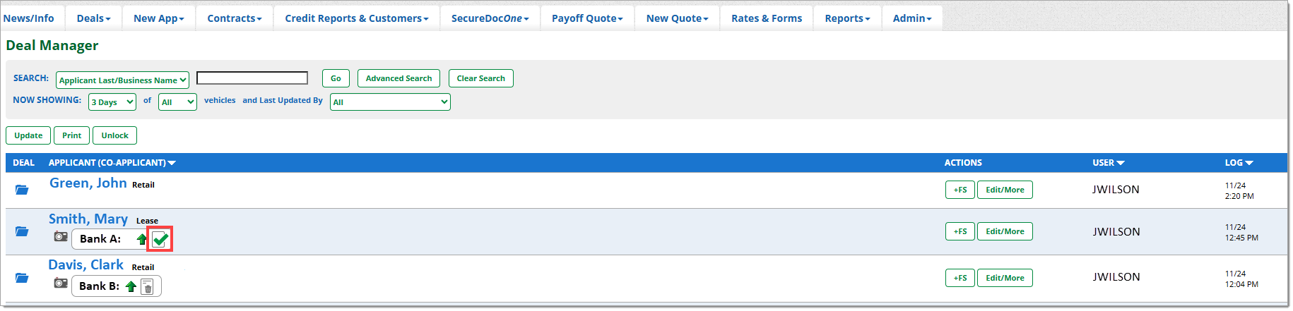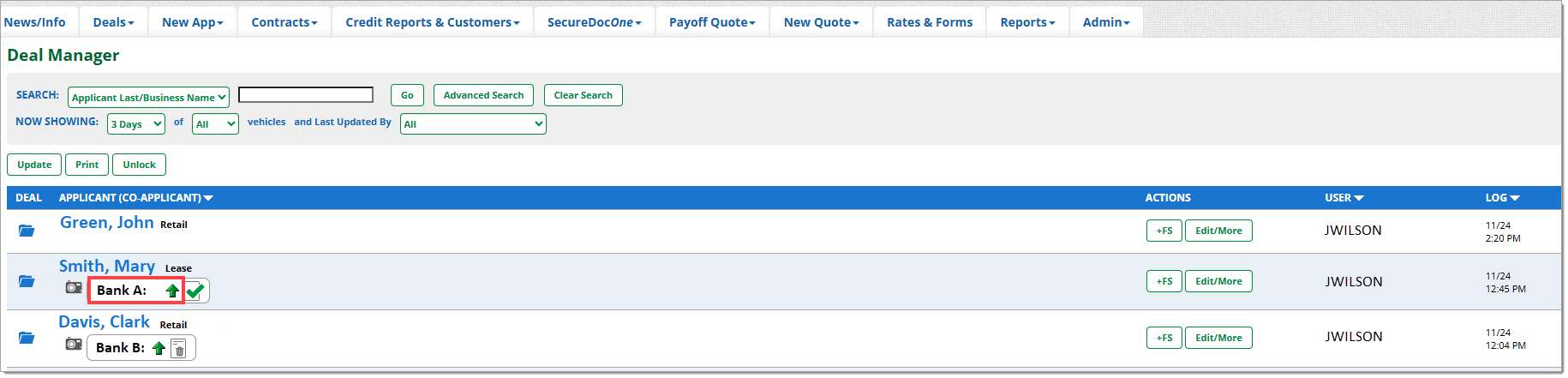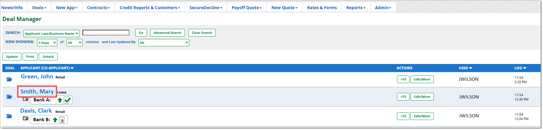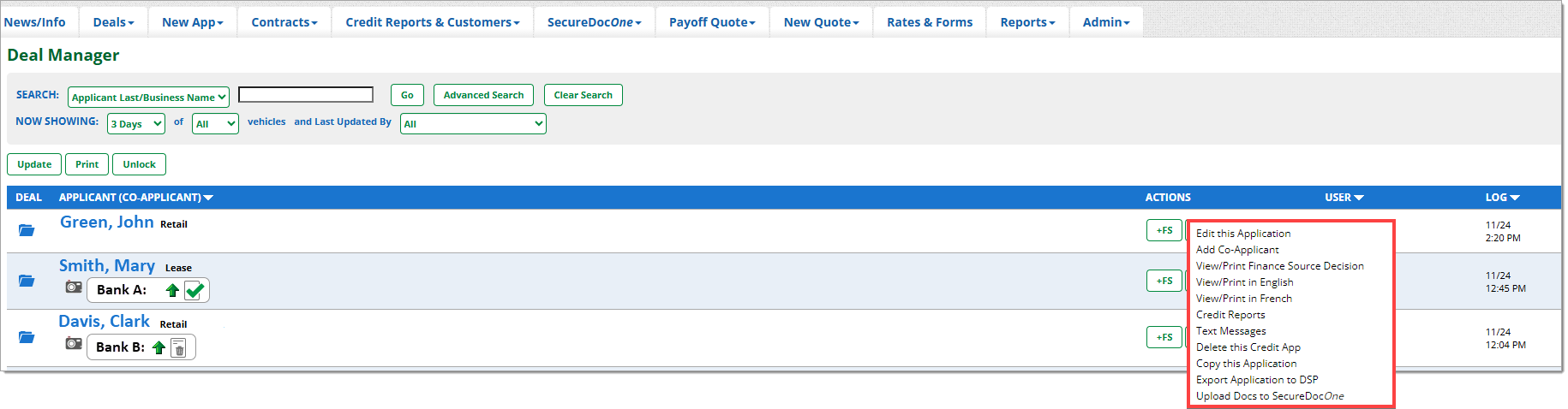 The Deal Manager is a primary navigation tab for RouteOne users. This is where you can perform the most comprehensive number of tasks and actions in the system. All credit application-related actions can be performed from the Deal Manager, including compliance tasks.