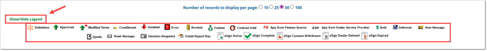 To view a legend of the various credit application statuses and their meanings, click the ‘Show/Hide Legend’ button at the bottom of the page. This allows you to identify the exact status of the application.