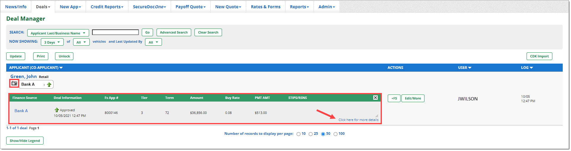 Clicking on the camera icon under the customer’s name will expand the section and provide a decision snapshot of the Credit Application. Clicking the ‘Click here for more details’ link will direct you to the ‘Decision Summary’ page, which provides more details about the deal.