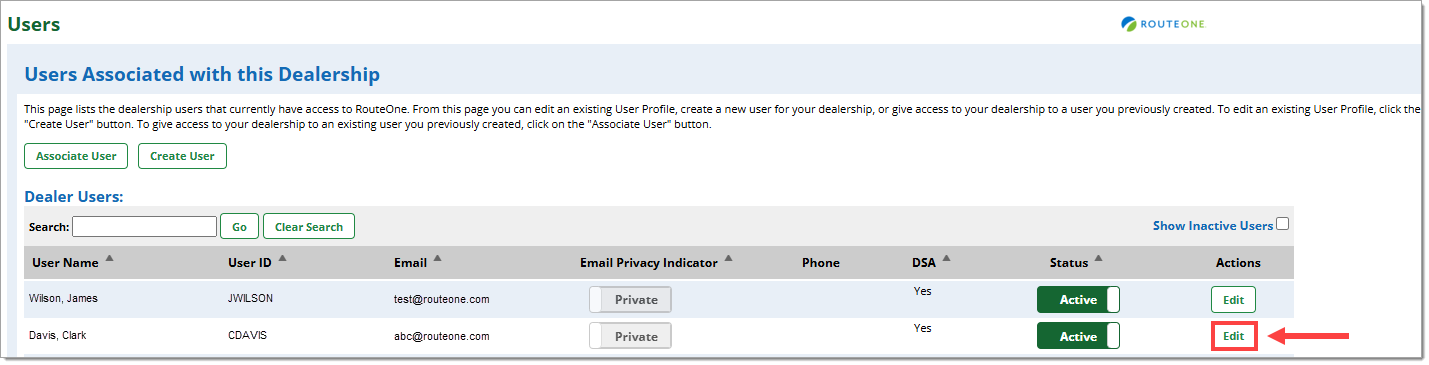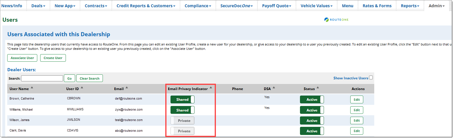 In preparation for the new RouteOne Enhanced Login process, we encourage Dealership System Administrators (DSAs) to prune their list of users and ensure that each user has a private and unique email address. To ease this process, we have updated the Users page to be more user friendly and to allow DSAs to make changes without having to click into each individual user profile.